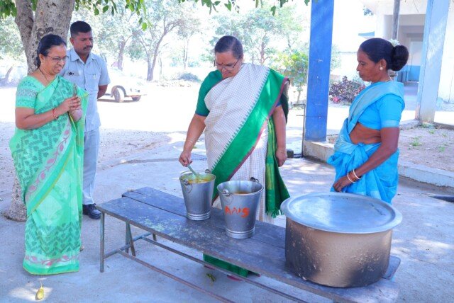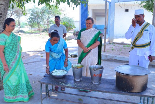 అక్షర న్యూస్ :చిన్నకోడుర్ మండలం అనంత సాగర్ గ్రామంలోని జిల్లా పరిషత్ ఉన్నత పాఠశాల లో మధ్యాహ్న భోజన ప్రక్రియను జిల్లా కలెక్టర్ కె హైమావతి క్షేత్రస్థాయిలో పరిశీలించారు. అన్నం, చిక్కుడుకాయ, సాంబారు, గుడ్డు వంటలను పరిశీలించారు. కామన్ డైట్ మెనూ తప్పనిసరిగా పాటించాలని విద్యార్థుల హాజరు ప్రకారం వంట సరుకులు కొలత ప్రకారం అందించి రుచికరంగా వంటా చేసే విధంగా చర్యలు తీసుకోవాలని ప్రిన్సిపల్ మరియు ఫుడ్ చెకింగ్ టిచర్ ను ఆదేశించారు. పాఠశాల సమయ వేళల్లో విద్యార్థుల ను ఎట్టి పరిస్థితుల్లో బయటికి వెళ్లకుండా ఉపాధ్యాయులు చూసుకోవాలి. విద్యార్థుల వద్దకు వెళ్లి ఆప్యాయంగా పలకరించారు. రోజు ఆహారం రుచికరంగా ఉంటుందా, సరిపోతుందా అని ఆరా తీశారు. నాణ్యమైన ఆహార పదార్ధాలను వాడుతూ రుచికరంగా వండాలని వంట సిబ్బందిని ఆదేశించారు.