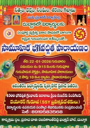 ( శ్రద్ధ + నిష్ఠ ఉన్న వారికే విద్య లభిస్తుంది).3 వ తరగతి నుండి 9 వ తరగతి వరకు తెలుగు చదవడం వచ్చిన విద్యార్థులు భాగం వహించగలరు. 22 గురువారం, జనవరి. ఉదయం 9.30 నుండి 1.30 వరకు. ఈ యొక్క కార్యక్రమం నిర్వహించడం జరుగుతుంది..స్థలం : శ్రీ రజనీకాంత్ రెడ్డి ఫంక్షన్ హాల్, దుబ్బాక.