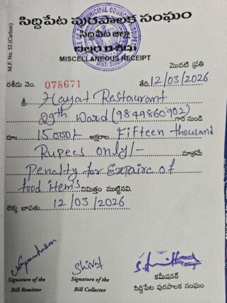 అక్షర న్యూస్ : హయత్ రెస్టారెంట్ లో భోజనం చేస్తుండగా బొద్దింక కనిపించిందని ఫిర్యాదు చేయడం జరిగింది. కమీషనర్ గారి ఆదేశాల మేరకు శానిటరీ సూపర్వైజర్ శ్రీకాంత్ గారు, SI లు శివ కుమార్ & సత్యనారాయణ మరియు EE అన్వేష్ లు హయత్ హోటల్ కిచెన్ను తనిఖీ చేసి వారికి రూ. 15000/- జరిమానా విధించి. ఇప్పటి నుండి ఇటువంటి ఘటనలు జరగకుండా చూసుకోవాలని సూచించారు.