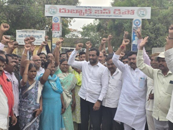 అక్షర న్యూస్ : దుబ్బాక ఆర్టీసీ డిపో వద్ద తమ న్యాయమైన డిమాండ్ల పరిష్కారం కోసం సమ్మె చేస్తున్న ఆర్టీసీ కార్మికులకు సంఘీభావం తెలుపుతూ వారి నిరసనలో పాల్గొన్న మెదక్ పార్లమెంట్ సభ్యులు మాధవనేని రఘునందన్ రావు గారు.